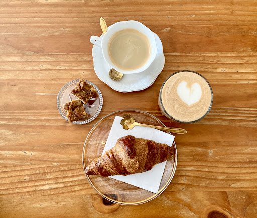 We ordered drinks, a croissant, and churros to take with us: a flat white with oat milk, an americano, and churros with chocolate sauce. The coffee tasted good, and the churros were yummy.