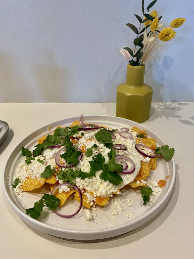 I got the Chilaquiles Roja. This is a Mexican breakfast of fried tortillas with spicy tomato sauce, sour cream, queso fresco, red onion, coriander. I also got this with a fried egg on top.