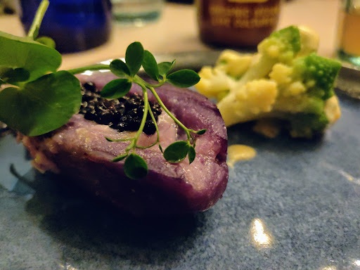 The menu is trendy. We had three starters that were meant to be shared: puff pastries filled with chili sin carne, purple moscovite potatoes with herring roe, and lightly blanched veggies with a cheesy dipping sauce. The potato dish was especially delicate. We cleaned out the cheese bowl.