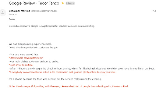 Als je niet tegen eerlijke feedback kan, begin dan geen horecazaak. Mensen hebben recht op hun mening, zeker als ze op een normale manier wordt gegeven. Jullie gedrag tegenover klanten is gewoon belachelijk en...
