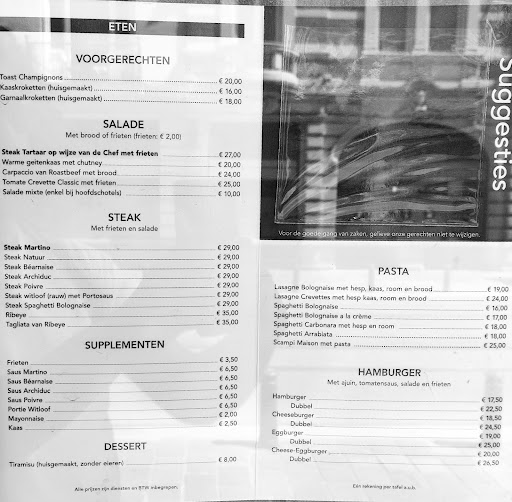Propere zaak, de ene keer vriendelijke bediening, maar soms niet zo, de dame des huizes is streng, zeer streng (mss bruut rechtvaardig) voor mensen die ze niet kent, zeer lief voor mensen die ze wel kent. Je kan zeggen dat ze een volksfiguur is en zich dat mag permitteren in haar zaak, maar voor buitenstaanders kan dit choqueren, want broer en zus en zijn twee zonen kunnen boos kijken, ook vriendelijk maar ook boos, heel boos, van broer wil je geen lappen ontvangen, van zus ook niet, van zijn zonen ook niet. Ooit was dit een zware buurt, uitgangsbuurt aan de Kuiperskaai waar vaak gevochten werd, en het glazen straatje, uitbaters moesten hun mannetje staan ooit, maar die tijd is al lang voorbij. De burgers zijn lekker maar prijs kwaliteit veel te duur. Gebakken gehakt, gewone tomaat, gewone sla, gewone lekkere tomatensaus en doorsnee friet voor 17,50€ is eigenlijk wel een beetje overdreven. Het is geen Angus of ander speciaal gehakt. Pas op, het is wel lekker, niet megatopzotlekker, gewoon lekker. Een voorgerecht Toast Champignon vind ik meestal lekker thuis, maar ik weiger dat te bestellen voor 20€, dit lijkt me zwaar overprijsd voor geroosterd brood en champignons, a la limite met wat sla en tomaat.... Voor extra mayo rekenen ze ook nog 2€ aan. Kriek, Duvel, Hoegaarden, Westmalle dubbel en Tripel 5€ is ook zotjes. Voor een Duvel ça va nog, is 8,5% alcohol, Westmalle ook ok, maar Kriek (3,5%) en Hoegaarden (4,9%), dat zou de prijs in een toprestaurant zijn dus dit lijkt me wat wereldvreemd. Niet alle bier is even duur hé! Dus als je gewoon lekker eet, veel wil betalen voor je eigenlijk maar krijgt, meestal een zeer vriendelijke en vlotte bediening krijgt maar soms als onbekende buitenstaander streng behandeld wil worden, 5€ wil neertellen voor Kriek, dan ben je gewaarschuwd. Mooie zaak, mooi heringericht, geen broodjes meer, vroeger wel. Vroeger was (niet) alles beter, maar de prijzen wel 😉 Succes Martino team, er is nog wat werk aan de winkel! Dit is geen aanval wegens persoonlijke redenen maar een eigen mening, vaststelling en uiting dat de aangeboden drank en eten te duur...
