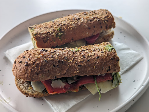 Buiten is dus ruimte om te zitten maar echt leuk is het niet. Je zit aan een doorgaande weg en parking. Als het regent is er alleen binnen een kleine plek om te zitten. Het is echt een take-away broodjes zaak dus snel wat eten en weer door. Geen plek om lang te zitten of voor de gezelligheid. Maar wel fijn dat je uberhaubt even kan zitten.