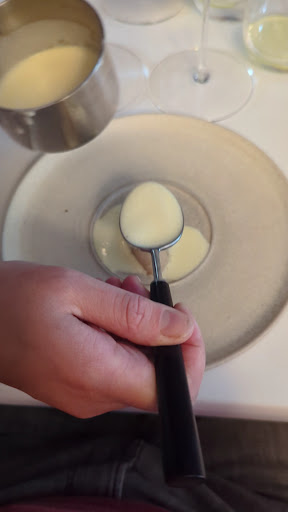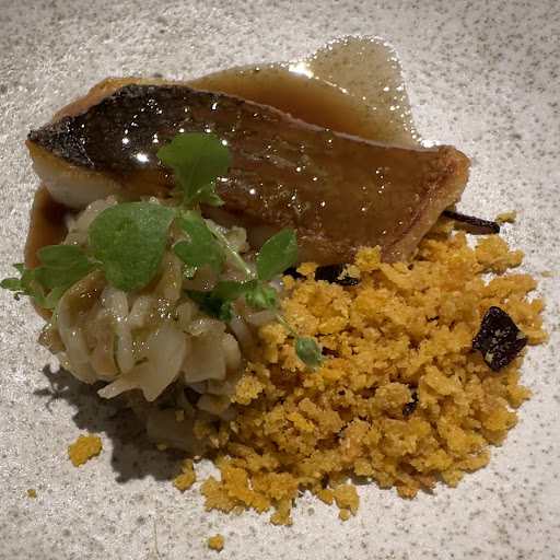 De eerste begeleider werd keurig door de Sommelière gepresenteerd, een Italiaanse witte van het huis Marco Porello gemaakt van Roero Arneis 2018, fris en sappig, in het aroma tonen van bloemen. Uit de keuken een hele mooie presentatie. Als basis een ring van plakjes sashimi van hamachi, erop dun geschaafde radijs met dunne plakjes rode biet en partjes van kers, centraal een groene saus die aan tafel werd aangevuld met een tomatensaus waaroverheen parels van sesam. De smaak van de delicate hamachi ging op in de krachtigere smaken van het garnituur. De wijn was in balans. (7,5)