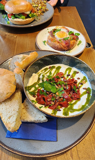 It looked delicious, but literally the only thing that tasted good were the potato wafers. We might as well have gotten some fries for a few euros. The bread was good, but both bagels were barely filled and just not tasty. The Queen Elizabeth Bagel seemed to contain half an egg, 1 cherry tomato, a small slice of cheese, a bit of mayo and almost no bacon. I could enjoy it. The Tony Texas Bagel was horrible. One bite and I was done. The pulled beef tasted like dog food. Again barely any toppings and overall just very sour.