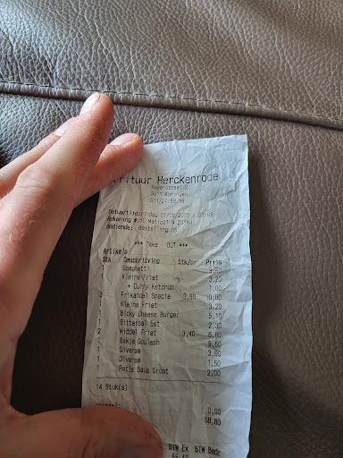 Frieten zijn niet meer zoals vroeger, véél "kepsel", lees krokante uitgebakken frietjes. Maar helemaal onderste boven waren we van de rekening. Saus wordt dubbel geteld zoals aangegeven, klein goulash potje wordt 9,5€ aangerekend, stond aangegeven €4,50, "maar dat is zonder vlees" wordt ons meegedeeld. Kortom te duur, en voel me toch bedrogen toen...