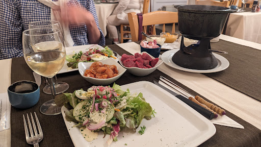 We visited this quaint little restaurant on a Sunday night and were happy to see the restaurant open and no bookings required. The hostess was very accommodating (we managed to converse via Google translate). The food I would describe as homely. Very tasty but not fine dining (although we did only have the fondue, so this may be different for the other dishes). We tried the red wine fondue which was a first for me (basically, instead of oil, a red wine stock is used) and it was very good. Portion sizes good and house wine well priced. The fondue was €22 each (needs to be 2 or more people). An appetizer of soup and quiche was provided. Overall we were happy with this restaurant and would...