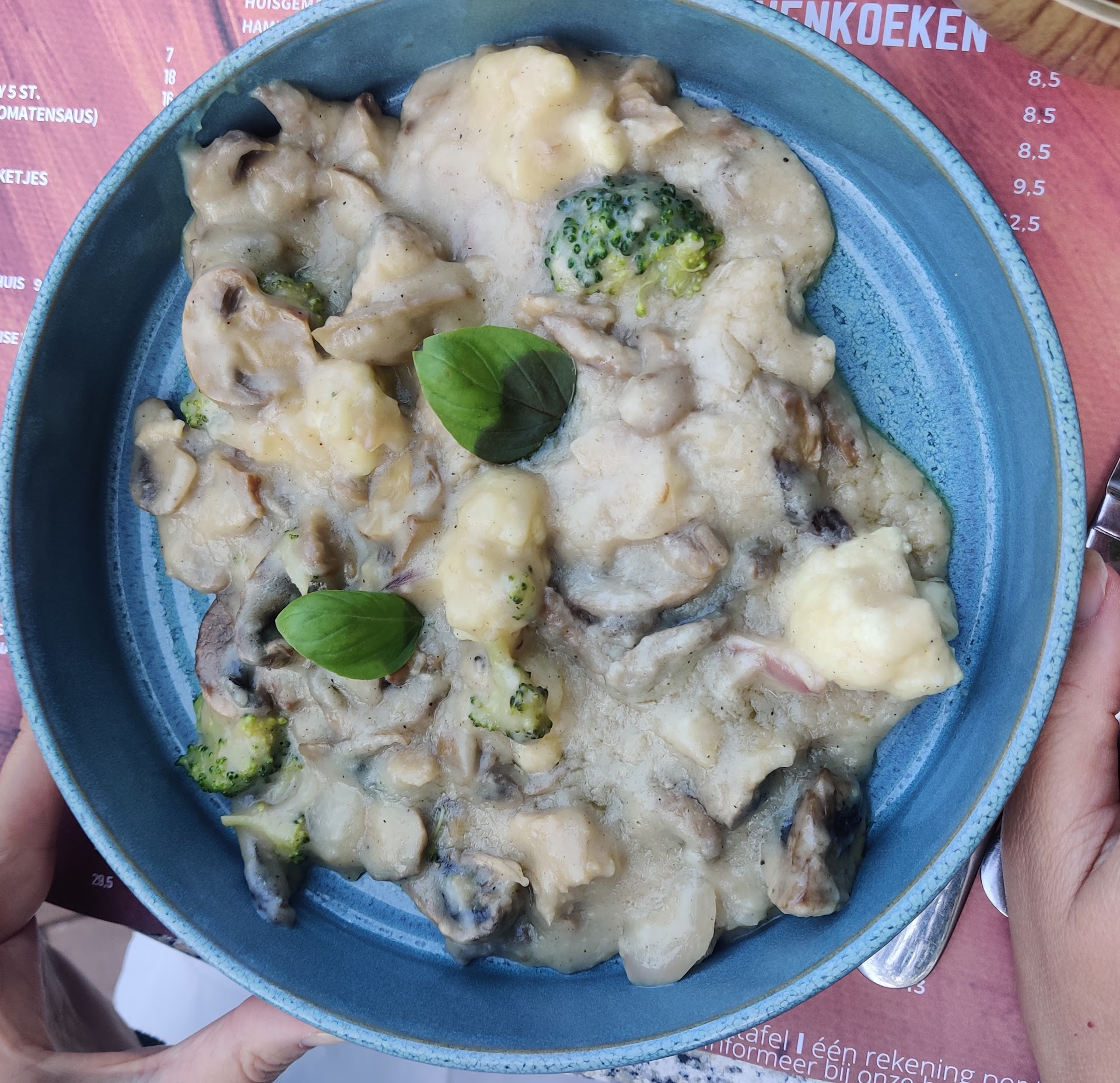 De vegetarische/vegan keuzes ogen op het eerste gezicht uitgebreid en veelbelovend maar is helaas erg teleurstellend in de realiteit. Zoals de rest van de kaart is het ten eerste abnormaal hoog geprijst, verder was er niet eens alles beschikbaar.... De vol au vegan maar geprobeerd... Welgeteld vier stukjes vegetarische kip in een smakeloze blubber waar de paar champignons zowat in versmolten waren, de enige kruiding was blijkbaar een buitenproportioneel hoeveelheid zwarte peper... Géén pasteitje erbij.... En daar vragen ze dan 25,50€!!!!! voor... Het was nog geen drie euro waard..... De salade smaakte ook raar, vooral de geraspte wortels zat een rare smaakje aan... De frietjes kwamen niet allemaal tegelijk, een deel kwam pas toen we al klaar waren met eten... En dan 6€ voor een halve liter water...... De kids menu alleen vlees of vis mogelijkheden...