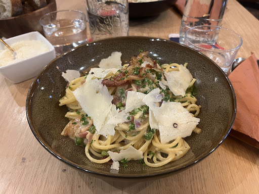 Read moreUNE FOIS MAIS PAS UNE DEUXIÈME FOIS !!!!!!!!!!!!!!! Quand ma belle fille indique qu' elle préfère ne pas manger de la viande, elle a eu droit a la glacial réponse du patron :je peut faire une chaîne autour ton cou et te mettre dans l'herbe. j'ai dit a lui que c'est pas du tout gentil de dire ça et pourquoi pas prévoir une menu pour les gens végétariens simplement. Mais avec le plat Fusilione poireaux que j'ai déguster; j'ai trouver deux petit tranche de jambon et une petit peu poireaux verte; beaucoup spaghetti tout pour 17.50 euro !!!! Et j'ai conclut que notre demande était...