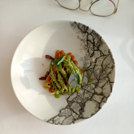 Door een sterfgeval moesten wij onze reservatie verplaatsen. Een tiental telefoontjes, vier e-mails en twee keer bellen aan de deur, maar nog geen contact. We gingen ervan uit dat we ons voorschot van âŹ225 kwijt waren en we met ons drieĂ«n ergens anders zouden moeten gaan. Pas enkele uren voordat de lunch initieel gepland was kregen we toch de melding dat de reservatie kon worden uitgesteld. In het restaurant dan. Na het voorgerecht vroegen wij aan de gastvrouw waarom zij zo moeilijk te bereiken zijn. De uitleg was dat zij en haar man, de chef, met uitzondering van een studente, alles alleen doen. Dat was meteen ook op een nogal arrogante, aanvallende manier verteld. Het was duidelijk dat zij het reservatieverhaal niet was vergeten. Wij repliceerden dat wij hen vooral wilden bereiken om niet de oorzaak te zijn van een lege tafel in hun zaak. âDat kon wel zijn maar wij hebben geen tijd om de telefoon te beantwoorden, mails te lezen of de deur te openenâ was het antwoord. Van een gesprek was het intussen al geĂ«volueerd tot een discussie en ook die escaleerde. Op een bepaald moment wilden wij de zinloze discussie stilleggen en tegelijkertijd zei de gastvrouw ons dat zij ons ging buitengooien. Zo geschiedde, we kregen nog wat geld terug en werden buitengezet. We betaalden meer dan âŹ180 voor aperitief met 2 hapjes en een voorgerecht en gingen met honger naar buiten. Vermoedelijk heeft het jonge koppel uitbaters door alles alleen te willen/moeten doen wat last van stress? Een restaurant van het niveau dat de prijs doet vermoeden kan je niet runnen met zân tweetjes. Dat vertaalt zich ook in het bord. Deze chef kan zeker heel wat beter dan wat we mochten proeven. In het menu waren ook asperges en morilles voorzien, die waren buiten het seizoen. Waarschijnlijk ook geen tijd om de kaart...