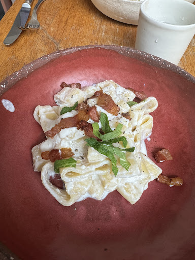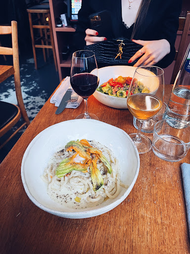 Read moreI’ve been here twice now but I remain unconvinced. The starter with burrata and zucchini is excellent, I ate it twice and there is nothing to complain about. However, the main dishes leave much to be desired. The first time I went I tried their famous cacio e pepe. The shape of the pasta was something unique (very thick noodles) but the sauce I found to be too salty. The second time I had some penne pasta cooked al dente accompanied by a very underwhelming simple ragu sauce. I also tried the calamarata pasta from my compagnon but also here the dish tastes like something you can make better at home. When you ask €23 for a pasta dish, you expect more value. It’s nice to be able to sit outside on a terrace and the waitress was kind but other than that I see no reason to come...