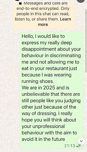 Things only worsened from there. We were served water in a basic plastic bottle—charged at an unreasonable €8 -I can accept higher price where it matches the experience. Starters were underwhelming and lacked flavour; the highlight was a €17 dish of feta smothered in honey, which set a concerning tone for the rest of the evening. Mains were not just disappointing but unacceptable. Although the meat was decent, it came with reheated orzo that was so evidently not freshly made and, shockingly, frozen vegetables served as a side with the main dish that were still cold and tasted metallic even. At €30 per dish, this is simply inexcusable.