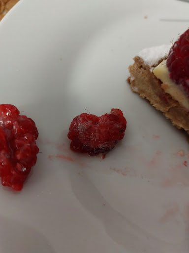 Après avoir goûté une part, la texture paraissait décomposée.. Mais en regardant en détail les fruits sur le gâteau, nous découvrons une belle moisissure par dessus, ça en dit long sur la fraîcheur de leur produits, attention !