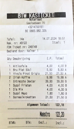 Na reactie hierop, waar men graag puntjes op de i ziet, ga ik hier graag in mee: Het ‘gratis’ vuurwerk stond inderdaad niet op de rekening, waarvoor dank. Had ik ook niet besteld. Maar wanneer ik bij mijn reservatie aangeef dat ik mijn verjaardag vier, dan doe ik dat vooral om culinair verwend te worden en niet voor vuurwerk. Dat kwam dus inderdaad samen met de 2 Irish coffee, die we verkozen boven de dessertenkaart, en die naar mijn mening net iets te weinig ‘Irish’ gehalte hadden. Maar dat zal dan wel aan mij liggen … Blijkbaar kan u niet begrijpen dat ik, eens mijn eten op tafel staat, ik dit niet meer terug naar de keuken stuur. In een restaurant, waarvan u pretendeert een voorliefde voor vlees te hebben, verwacht ik wel dat mijn steak ‘in één keer correct gebakken wordt. Net voor die liefde was ik gekomen … Dat u dat traditioneel in een pan doet is een opmerking die niet terzake is. In elk huisgezin doet men dit zo. Het getuigt dus niet echt van uw ‘voorliefde voor vlees’ en is daarnaast zeer onhygiënisch om mijn vlees voor een tweede keer heen en weer te moeten brengen. Daar hou ik niet van en dat is meteen ook de reden dat ik u daarover niet direct heb geroepen. De bediening vroeg mij of ik ook ‘een slaatje’ wou. Aangezien ik ook graag groente eet, en de vraag liet vermoeden dat die niet standaard op het bord liggen, resulteerde het in een witloofsla van 4€. Niet voor de echtgenote dus, net als de mayo. Ben ik nu een muggenzifter? En ja, het vlees was lekker maar te rood. En ja, garnaalkroketten ‘verdienen’ een krokant jasje, al was het maar uit ‘voorliefde’ voor ons Noordzee product.