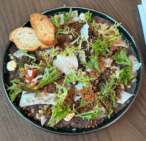 Read moreHad een steak besteld met pepersaus maar spijtig ik denk dat hij de les om sauzen te maken heeft gemist in school dat was nog in de verte niet in de buurt van een pepersaus Spijtig want het vlees was wel mals en lekker en bovendien de hapjes die we vooraf besteld hadden zoals de brusetta waren lekker maar te duur alvast volgens mijn mening De setting is leuk maar rumoerig het galmt enorm je kunt moeilijk rustig praten met je...