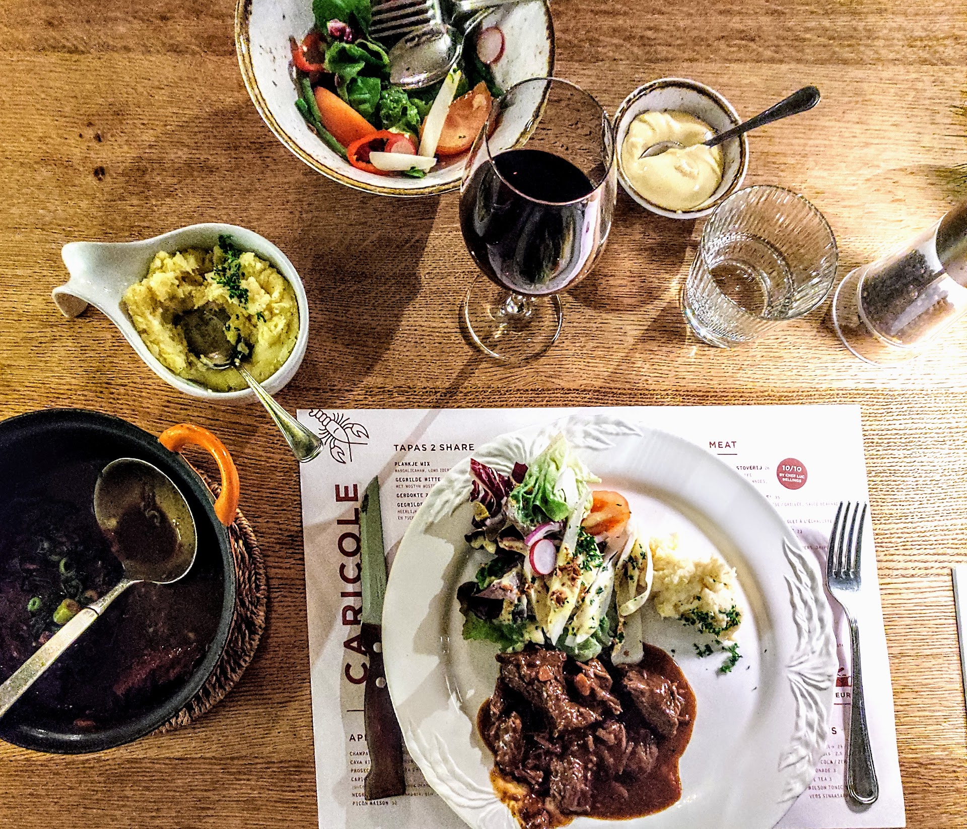 Read moreDe Vlaamse stoverij zelf is best lekker, al mocht deze nog meer gekruid zijn. De hoeveelheid dat je krijgt per persoon is vrij groot. Alsook het bijhorende slaatje was een grote portie. In het slaatje vond ik niet enkel Vlaamse groenten maar ook stukken paprika wat ik iets minder vond, de tomaten waren ook helemaal niet op z'n rijpst. In de plaats van frietjes vroeg ik puree, maar ik betwijfel heel sterk of deze huisgemaakt was, al kan ik mis zijn, ik proefde gewoon totaal geen boter en nootmuskaat. Over het algemeen was het gewoon ok, zeker niet slecht en op zich ik herhaal het de stoverij op zich is best lekker. Luc Bellings gaf hen 10/10 wat ik uiteraard echt "overrated" vind, maar ja, de commerce moet draaien. Qua inrichting is er 1 klein probleem: de akoestiek. Je hoort alle andere gasten luid praten, de muziek verdween onder het geroezemoes zonder dat de zaak vol zat. Pluspunt is hun duurste huiswijn. Een primitivo uit Puglia. Volgende keer probeer ik de bouillabaisse royale met een halve kreeft. Wel benieuwd! De service was zeer goed, heel vriendelijk. Bedankt voor het extra shotje limoncello. Petje af voor het bedienend personeel. Liever eerlijk dan nutteloos verheerlijken. Tot de...