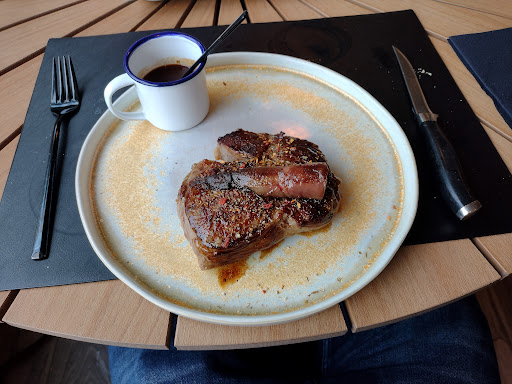 Read more2022-06 We fietsten er naar toe voor de lunch wegens de originele kaart die we vonden op het web. 92% van de huidige (103) beoordelingen op tripadvisor zijn zeer goed of uitstekend. We kunnen dat bijtreden. Bij de aangeboden amuses "share-den" we nog een "witte worst by Dierendonck" @18⏠en de huisgemaakte kaaskroketjes (5) @17âŹ, niet goedkoop maar lekker bereid. Mijn picon werd Ă la minute gemaakt door een zeer vriendelijk en gedienstig kelnerinnetje, de beste die ik al had aan de kust (de picon). Als hoofdgerechten voor mezelf de "cube roll ribeye selection by Dierendonck" @ 38âŹ. Kon iets mooier bleu zijn, stond op de afrekening als Black Agnus Ribeye en mocht een paar ⏠goedkoper zijn. Wel dik in orde! Voor de eega één van de suggesties: gebakken tarbot met mousseline @39⏠waarbij de chef op vraag puree bereidde. Ze vond hem OK (de tarbot). De Portugese wijn @ 32⏠paste perfect bij het vlees, mooie wijnkaart trouwens. De chef is een sympathieke professional en quasi alles wordt er in eigen keuken bereid. Bij mooi weer zou een aangenamer terras zeker extra...