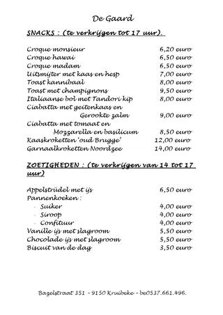 De klant wordt er behandeld op een onprofessionele manier. De eerste dienster kon ons niet vertellen wat het aperitief van het huis was. 75% van de op de menukaart vermelde voorgerechten waren niet meer te verkrijgen. De niet meer voorradige gerechten waren volgens de ene dienster te wijten aan het vele volk dat 's middags was komen eten en volgens de andere het feit dat ze kortelings in verlof gingen.Het varkenshaasje van mijn vrouw was taai, nog nooit meegemaakt. Mijn Filet Mingnon was ok. De bestelde Franse wijn was niet meer verkrijgbaar, in de plaats kregen wij volgens de dienster een andere Franse wijn. Toen zij aan tafel met de geopende fles toekwam, bleek deze wijn een Californische te zijn. Nadat wij ons hoofdgerecht genuttigd hadden, de tafel afgeruimd was, hebben wij nog drie kwartier zitten wachten of men nog iets zou komen vragen aangaande een nagerecht of koffie. Wij zijn toen opgestaan en zijn gaan afrekenen. Toen bleek wel onze bestelde Franse wijn op de rekening te staan alhoewel we deze niet gekregen hadden. En de plaats van de ons toegewezen tafel was ook allerminst gezellig, nochtans waren wij de eerste in Afspanning De Gaard. Algemeen kan men zeggen dat DE GAARD te vergelijken is met een goedkoop eetcafé met waarschijnlijk personeel dat van horeca weinig afweet. Volgens mijn bescheiden mening...