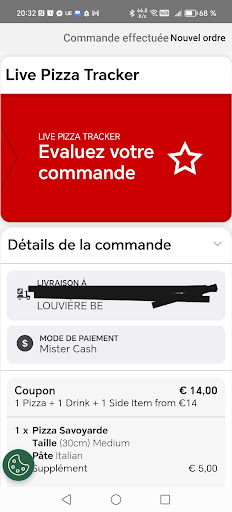 Read moreAccueil téléphonique très froid et sans aucune politesse. On ns annonce 20minutes d'attente...on a attendu plus de 40minutes.les pizzas froides ne correspondant pas à nos commande dutout. Je voulais une pizza avec viande ,type pitta,dont j'ai oublié le nom....mon fils paie nos pizzas....trois pizzas .l'une avec 6petits morceaux de champignons et hyper piquante. Les 2 autres (kebab),ont été remises remplacées soit disant par des poulets sans autre forme d'explication....en arrivant chez nous....les pizzas poulet ne contenaient aucune trace d'aucune viande,juste trois fines lamelles de poivrons jaunes,noyées sous une sauce genre barbecue hyper piquante. Ce qui n'a pas fait mon bonheur,ayant de gros soucis d'estomac....la devanture du lieu ressemblant à un buibui sale... Bref....c'était une 1ere fois chez dominos,c'est la dernière...