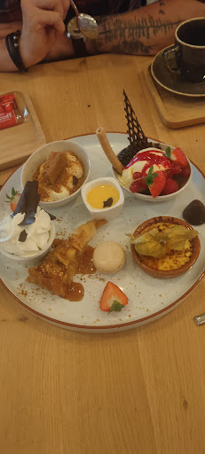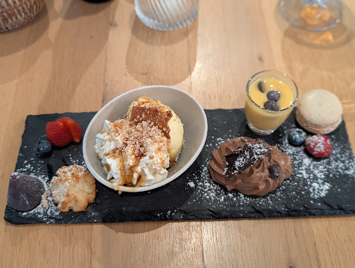 Read moreWat een gezellig eigentijds interieur heeft deze zaak! Het eten was verfijnd en erg lekker, bordjes heel hip gedresseerd. Doch niet de reden dat we 5 sterren geven, die zijn volledig te danken aan de klantvriendelijkheid! We hadden vermeld dat we met een baby en kleuter kwamen, dus of we een tafeltje dicht bij de speelhoek mochten. Toen we toekwamen zagen we dat de tafel erg gezellig ingericht was, met kleurplaten en kleurpotloden, naast de speelhoek. Na een lekker biertje als aperitief en een zeer verzorgde hoofdschotel kregen de kindjes elk een helium ballon, entertainment top natuurlijk. Ik koos voor de dessertschotel met allemaal 'kleine' hapjes (eigenlijk best wel volwaardige porties). Kreeg ik niet op, gelukkig kon mijn man helpen. Ontzettend lekker! Een zaak uit de duizend, Je voelt je hier welkom (we kwamen ook al zonder kinderen en even goed bediend hoor!). Klantvriendelijkheid zoals we ze...
