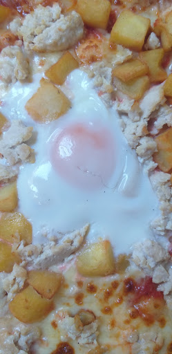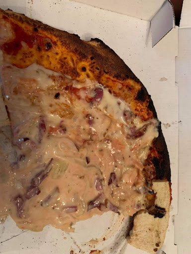 Mon homme commande une pizza "tratiflette" (de base sur la carte: tomate, mozza, crème de lardon, pommes de terre, oignons et reblochon..) voila ce qu il a... 3 tout petit morceau de pomme de terre et... bin de la crème fraîche et quelques paires de lardons point barre en faite... (voire 1ère photo)