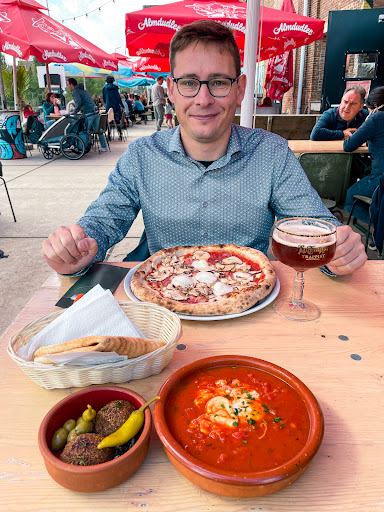 Deze review is tot stand gekomen om het begin van een succesvolle google review carrière op te starten. Doordat het gelukkig ook een positieve review zal zijn lucht me erg op. Ik begrijp dat iemand dit ONTERECHT in twijfel zou trekken omdat dit effectief mijn eerste review is. Pas later kwam het idee tot stand om de review te structuren volgens de vier TERECHTE sterren (durf dit zeker niet in twijfel trekken). De eerste ster gaat naar (trommelgeroffel enzovoort) DE LOCATIE: HAL 5 is toch wel het walHALla der hallen en bijenkomst van menig bakfiets lovers (er stond er zelfs een IN de zaak). Het is familievriendelijk (zo zijn er telkens niet één maar twee huilende babies aanwezig). Er vinden plots zelfs rolschaatspistes en schaatsbanen plaats. Het was wel een beetje koud in de zijvleugel. De meeste mensen die zich in het MIDDEN bevinden hadden hier hoogstwaarschijnlijk geen last van en genoten van een zalig WARME omgeving. Moest je na je bezoek ZELFS behoefte hebben aan quinoa kan je dit in het automaat om de hoek halen met je bakfiets op de bakfietsparking!! De tweede ster gaat naar de bediening woehoe!!! bediend worden is de max! Onze complimenten aan het IT team van de hal. De bestel app is veel gebruiksvriendelijk geworden dan zijn zielige voorvader, waarvoor dank om de verwarring te verminderen. Het feit dat er Engels (EN Nederlands) gesproken werd maakt het hele gebeuren internationaal toegankelijk én exotisch!! En dan NU de belangrijkste ster ...... u raadt het al hoor ... (slimmerik), nou, het is toch wel niet (jaja) ... (oei wat was het nu weer??) aaaah ja het is de derde ster, het ETEN! mmmm. Het was niet slecht, maar juist goed hoor! Het verruimt je culinaire kennis door je kennis te laten maken met gekke kazen zoals akkawi en dergelijke,,, de falafel was moeilijk te omschrijven dus houden we het bij dat ze voedzaam waren. Mijn ijzerwaarden zitten weer op een goed peil, zei de dokter. Okeee dat was het voor de voeding voorlopig denken we want ja zo reviews schrijven is toch moeilijk zonder ervaring. Had dat toch niet zien aankomen dat daar zo veel bij te pas kwam. VOORAL omdat de oplader van mijn pc echt SUCKT!!! Oké ja is lastig hoor pffffff, ben het beu. AHJA nee wacht :o de laatste ster is de belangrijkste goh nee toch niet maar wel ja wel echt gewoon heel belangrijk hoor!!! De grootste domper was de verpakking en tevens de laatste en vierde ster :( de zilverfollie (!!!) en bordje en vooral takeaway zakdoekje was prima en veelbelovend en had op geen enkele manier een impact op de habibi ervaring. Desalniettemin was het toch maar een smeerboel me dunkt pfff. Aan wie dit juist lag laten we in het midden. We hebben wel een DONKERbruin vermoeden dat dit potentieel lag aan de combinatie van de loperige yoghurtsaus en de plooitechniek/origami kunsten van een niet verder te benoemen betrokken persoon van de zaak??? De functie van het doekje werd vrijwel meteen teniet gedaan doordat een ander niet nader te benoemen persoon deze niet tijdig van het smos oppervlak had verwijderd. Wie zijn schuld dit is laten we ook in het midden.... Plots viel er gewoon een falafel uit de compositie. Excuseer hoor maar dat deed pijn. Allez daar kom je dan toch wel voor en dan valt die uit de boot, spijtig spijtig. Van dat moment ging het eigenlijk maar bergaf, dus deze twee gebeurtenissen hebben ons ook al persoon veranderd; in welke richting weten we zelf voorlopig nog niet. Smosboel alom.. ... . Er lag meer wrap op het bord dan in de wrap. We waren vergeten wat een VORK in het Engels is dus die hadden we niet (tijdig) kunnen benuttigen waardoor het gewoonweg niet lukte om die zaken van het bord te halen. Nochtans waren we wel benieuwd welk materiaal gebruikt geweest zou zijn voor dat bestek. Als potentiële Deloitte duurzaamheidsconsultant zal ik wel een visitekaartje bezorgen indien hulp gewenst. VERRASSING (wOw how zeg) jaja een geheime halve ster voor het inspireren van deze nieuwe carrière. Ik heb mijn studie opgezegd vooraleer ik de deur als een nieuw persoon buiten wandelde! Bedankt Habibi en...