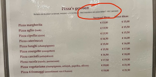 About a week ago my boyfriend and I ordered a split pizza. One halve would be like a ‘pizza carnivora’ and the other side would be like a ‘pizza al pesto’. The waitress warned that there is €5 cost for sharing a pizza with 2 people. This seemed fair. We expected to pay €26 for our normal size split pizza: the €21 price of a pizza carnivora (which is slightly more expensive than the al pesto) + the €5 fee for sharing a pizza.