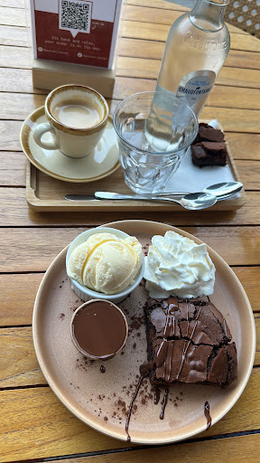 We sat down at a table and ordered using the QR code. We received our order half an hour later, where people came after us got theirs earlier. Because we ordered online we were never informed that it would take 30 mins. During that half an hour our table was never cleaned. When we received the order we were told that there was a self cleaning system which is not mentioned anywhere I could see, that's why it was never cleaned. So basically if you're sitting somewhere you have to clean other people's leftovers if they didn't clean after themselves. As for the food, the cake was alright, but the "iced" cappuccino we ordered was warm. We were given some ice after request but it wasn't great. So in general, we...