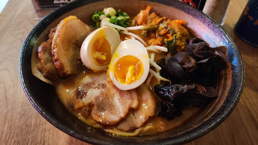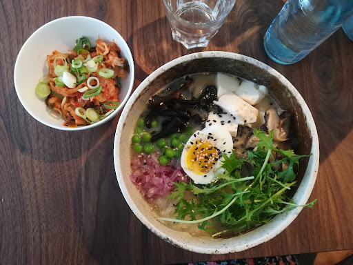 Read moreWe went there for lunch and the small, cute stylish place was really quiet. Apparently it's the busiest in the evening. I had the only vegetarian ramen noodles option with a side order of kimchi and my partner had the Chef's special. Our food arrived quickly but mind that we were the only customers at that time. The veggie is in a soft not too salty miso flavored broth with chewy noodles, funghi, red onion, green peas, soft tofu, scalions, semi runny egg and the spicy fermented vegetables which we're mild spicy-sour. I really liked the tofu, it almost breaks apart when you try to pick it up. I would have liked that everything in my ramen had the same temperature, some ingredients were still cold but fresh. Also got the Japanese lemonade 'ramune' and it came in a funky shaped bottle with a whale on it and a marble in it. The taste is like Sprite but softer. The service was friendly but the kitchen was pretty loud, since it's an open kitchen concept. U are offered a bib because of all the broth and the you can eat with chopsticks and an...