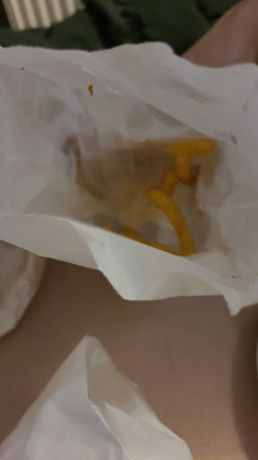 Read moreSi je ne pouvais pas mettre d'étoiles tous court je l'aurais fait... Payer plus de 30€ pour attendre 2h30 pour avoir des frites tièdes voir froide qui colle et qui son molles c'est tellement gras que le sachet en était transparent... Des bâtonnets mozarella qui son tous mou et non croustillant ni fondant qui son fade elle aussi... Deux burgers qui son censé être aux poivre j'ai eu l'impression de manger un vieux sandwich mayo... Honnêtement j'ai manger parce que j'avais faim autrement dit je ne commanderai...