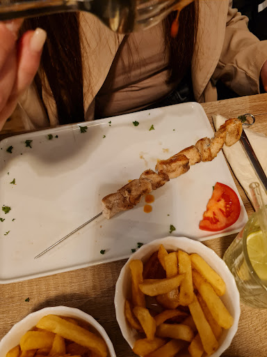 Une de mes amies commande la brochette de poulet et mon ami commande de la viande de bœuf bifteki. Les deux plats étaient accompagnés de frites (supplément) mais il n'y avait rien d'autre qui accompagnait la viande. C'était sec et sans sauce (voir photos) Bizarre, surtout pour un tarif pas donné.