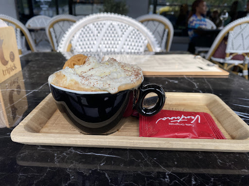 The restaurant is very popular, so if you want to eat or drink here, you need to come on time. Price is standard for a brasserie. On average €25 per main dish. You can view the menu on their website in advance.