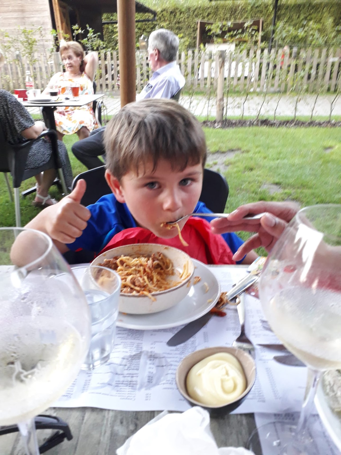 Read moreWe hadden een plaatsje in de tuin, waar het gezellig vertoeven was. We waren nog maar net gezeten of daar was de ober al om de bestelling op te nemen. Die snelheid ebde helaas weg naarmate de avond vorderde. Eerst dronken we een aperitief en we bestelden nacho's uit de oven. De cocktails waren lekker, de nacho's minder. Ze zaten val met grote stukken tomaat en een beetje gesmolten kaas moest weggeven dat ze uit de oven kwamen. Ondertussen wilden we ons hoofdgerecht bestellen, maar het bleek moeilijk om een ober vast te krijgen die bestellingen mocht opnemen. Wel een kleine shoot-out naar de jonge blonde dame die geen bestellingen mocht doen, maar telkens haar best deed om zo snel mogelijk een collega te vinden. Hoofdgerecht kwam op tafel. Paling in het groen besteld. Paling was perfect klaargemaakt, kwam vlot van de graat. De saus was helaas wat flauw, maar met peper en zout ging het wel. De kindersteak bleek wel heel lekker (en groot). Ook de spaghetti en de cheesy bacon burger werden gesmaakt. Dan het dessert. Na weer maar eens een hele tijd wachten, eerst om op te nemen, dan om te brengen (bijna drie kwartier voor drie dessertjes), kwamen de nagerechten op tafel. De moelleux zag er lekker uit en dat was hij ook, de milkshakes waren een regelrechte ramp en zorgen voor aftrek van een volledig punt. Hoe je het klaarspeelt van een milkshake te maken die niet koud is, is me een wonder, maar hier krijgen ze het voor mekaar. Bovendien was hij veel te sterk van smaak. Alsof ze gewoon dikke room hadden aangelengd met smaakstof. Al bij al wel aangename avond gehad, wegens een gezellige sfeer en een speeltuin voor onze jongens. Er zijn heel lekkere dingen op onze tafel gekomen, maar zeker niet alles. De bediening is vriendelijk, maar het systeem waarbij slechts de helft van het personeel bestellingen kan...