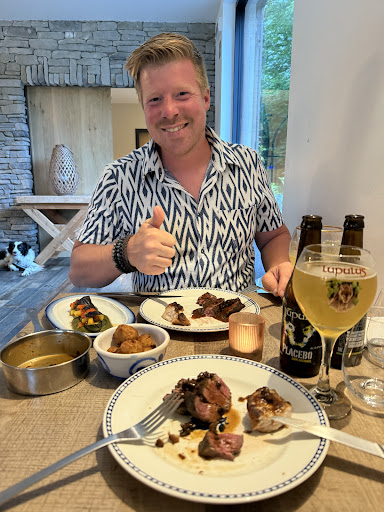 We verbleven 1 nacht in dit hotel/restaurant. We kozen heel bewust voor een plek waar we beiden konden combineren. We werden niet teleurgesteld! We namen het menu van de chef. De gerechten zijn bijzonder lekker, bestaan uit combinaties die we zelf niet onmiddellijk kunnen verzinnen. Een feest voor de smaakpapillen. De bediening is eenvoudig en staat wat in contrast met de kwaliteit van het eten. Enkele tips: plaats een schotel onder de ijsemmer, of voorzien een aparte houder, zo wordt de tafel niet nat van de condensatie. Een servet over de ijsemmer om de fles mee af te drogen voor het schenken, ook hier om water op tafel te vermijden. Zorg voor voldoende bestek na het opnemen van de bestelling, we hadden voor- en hoofdgerecht maar slechts 1 bestek. We hebben moeten vragen naar een nieuw/proper mes en vork. Zorg dat de wijn is ingeschonken voor het eerste gerechten op tafel komt, onze wijn kwam pas nadat ons voorgerecht al op was. De reactie van de bediening hierop betreurenswaardig "ik heb maar 2 handen". De drankkaart mag vernieuwd worden en in dezelfde stijl als menukaart en wijnkaart aangeboden worden. De huidige versie, enkele blaadjes op een clipboard, oogt slordig. Voorzie misschien ook een eenvoudiger of toegankelijker gerecht voor de gasten die in de tipi tent verblijven, of voor een gezin met kinderen. Dit zal het geheel naar een hoger...