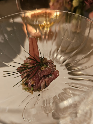 Read moreErg mooi kader en leuke ontvangst. De zaak roept om hoge standaarden maar er liep toch vrij veel mis. Champagne was erg lekker maar werd geserveerd in een wijnglas. Na een klein amuze toch een dik uur moeten wachten op onze voorgerechten. Deze waren goed maar zeker niet speciaal te noemen. Dan nog maar eens een dik uur wachten op het hoofdgerecht. Een cote a los geserveerd op een leisteen. Helaas veel te snel koud alsook de geschifte bearnaise die duidelijk terug was opgewarmd. Wijn werd pas halfweg ons maal opgenomen en geserveerd als onze eetlust voorbij was. De vrouwen aan tafel werd zelfs in hun haast geen glas wijn gegund. Door het wachten wel een extra glas champagne gekregen maar die fles stond al even open. Dessert hebben we dan maar geskipt om nog voor een ´huisgemaakt´ limoncellotje te gaan. Deze was echt sirooperig en niet koud genoeg. Mijn vrouwelijke tafelgenoot kreeg een muntthee. Was gewoon warm water met 4 muntblaadjes in. Dit werd wel recht gezet maar je merkt aan zowat alles dat hier nog veel werk aan de winkel is! De prijzen zijn vrij hoog en nogmaals het kader vraagt om klasse. Het was een aangename avond maar dan eerder met dank aan ons gezelschap. De teleurstelling in de rest was er wel... Kleine tip. De man met de snor zeker houden, heeft erg...
