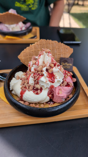 Dit landelijk gelegen ijssalon is een echte aanrader voor wie even wil ontsnappen aan de drukte. Vooral in het tussenseizoen geniet je hier van een heerlijk rustige sfeer, al blijft het duidelijk een populaire plek met steeds voldoende volk. Voor mijn eerste bezoek bestelde ik de coupe meringue, en die stelde zeker niet teleur. Het vanille-ijs was lekker, al mocht de smaak wat uitgesprokener zijn. De twee grote bollen werden vergezeld door een flinke toef slagroom en een royale portie frambozensaus, mooi gepresenteerd. De frambozensaus leek niet huisgemaakt, wat jammer is, want ik zou zonder twijfel 2 à 3 euro extra betalen voor een echt ambachtelijke variant. Een paar afgewerkte verkruimelde meringuekoekjes, een verse framboos of twee zouden de coupe helemaal afmaken, ook al zou dat een kleine meerprijs betekenen. Ook miste ik bekende klassiekers zoals Poire Belle Hélene, Coupe Negresco of een Péche Melba op de kaart. De prijs van 12 euro vond ik meer dan correct voor wat je krijgt. Het grote terras lijkt me ideaal voor zomerse dagen. Enige minpuntje: de inkom is wat vreemd aangegeven. Na mijn gevoel te volgen, stond ik plots in de toiletten – al moet gezegd worden dat die keurig proper waren! Zeer mooi interieur met een correcte bediening . Al met al een fijne ervaring en zeker een plek om nog eens...