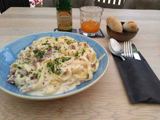Enkele minuten nadat we de kaart kregen konden we bestellen, bij bestellen bleek jammer genoeg de kip op te zijn. Vreemd, het was niet echt druk, maar goed kan gebeuren, vertel dit dan gelijk bij de kaart. Vervolgens vraag ik wat er voor de kinderen is, blijken 5 gerechten te zijn voor gemiddeld 8 euro maar allen met rundvlees. Mijn kinderen eten dat niet dus ik vraag naar andere opties, geen mogelijkheid om iets aan te passen. Voorstel om de kaaskroketten voor 11 euro te nemen. Prima voorstel echter wordt deze geserveerd met brood en sla dus moet er los friet en saus bij waardoor het 15/16 euro wordt. Met 2 kinderen is de lol er dan wel van af..zeker als je normale kinder gerechten 8 euro zijn. Hier kon men wel wat flexibeler zijn...uiteindelijk een hoofdgerecht extra en op 2 borden laten serveren wat goed ging. Over het eten zelf, de tagliatelle scampi look was heerlijk, de salade ook, de varkenshaas was te lang gebakken en taai. De champignon saus was lekker en ook de ijsjes...