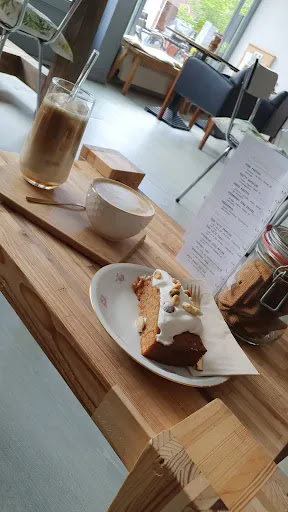 Read moreLekkere vegan carrot cake gehad, ze hadden een aantal soorten gebak waarvan er 2 of 3 vegan waren. Latte macchiato besteld met havermelk ( €0,60) maar kreeg een grote cappuccino. Iced latte met havermelk en salted caramel siroop was lekker, wel erg veel ijs (=goedkoop). Schattig hondje was in de zaak aanwezig, een Franse bulldog, maakt het wel gezellig. Betalen kon alleen cash of met Payconiq. Bestellen aan de toog (je wordt niet aan tafel bediend).