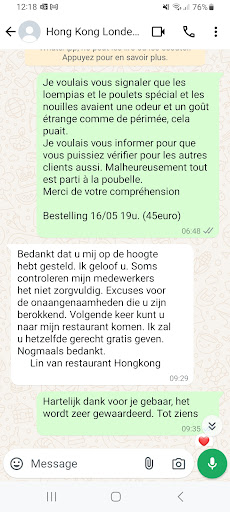 Je mets une etoile car je ne peux pas en mettre 0. Car ne merite aucune reconnaissance. J'ai commandé un chinois à emporter qui a fini à la poubelle car le poulet sentait mauvais. Ayant 3 enfants impossible de leur faire avaler cela. J'ai donc envoyer un message pour faire part du souci rencontré, très commerçante me répond par SMS que cela arrive que ça marchandise n'est pas fraîche que ses employés ne font pas très attention et que donc prochaine commande la même sera offerte. Ceci dit, date du mois de mai juin... et je recommande seulement 5 mois plus tard donc le problème n'était vraiment pas le montant qui a fini à la poubelle. Mais comme par hasard elle ne se souvenait plus de cette conversation. Et fini par me dire qu'elle n'a pas besoin de client comme nous mais à savoir que nous sommes aussi restaurateurs... donc vraiment pas commerciale. J'ai meme pris la capture d'écran des message échangé. Je pense tout simplement qu'elle avait besoin de 45 euro à mon avis pour clôturer sa semaine. Et attention j'ai payer le prix plein et je suis partie mais ne me verra plus jamais. Dommage car c'est le seul chinois de Londerzeel. Si elle fait comme ca avec tout le monde elle peut...