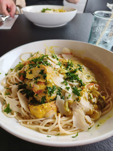 my wife and I are going to be coming for lunch here a LOT more often. The photo of the empty plate is all that is left of a fantastic chicken toast with egg and bacon crumb. Was it a club sandwich (chicken w bacon) with egg added? Or a bacon and egg sandwich with succulent, lightly grilled and sliced chicken brest on top? But lightened by serving open face. And .. highlight! ! At this bistro Ginger tea equals a chunk of ginger root sliced fine and left to steep in boiling water .. lift the strainer out when it's intensity is to your own taste! My wife's deep fried finger food selection was done with a perfect crustiness, no grease, and piping hot at the table .. yummm-meter...