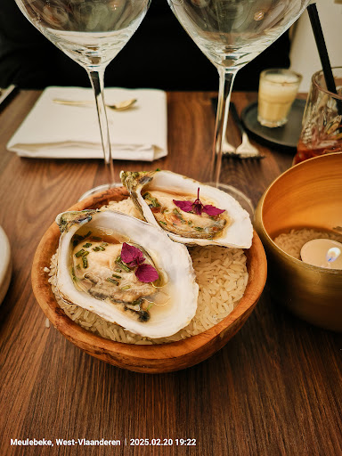 We kozen voor het viergangenmenu met aangepaste wijnen en genoten van een verfijnde ervaring. De hapjes werden door de chef zelf geserveerd, wat een extra persoonlijke toets gaf. Er werd zonder probleem rekening gehouden met een zwangerschap, waarbij een heerlijk alternatief werd voorzien voor de rundstartaar: een smeuïge risotto met wintertruffel en parmezaan. Het tweede voorgerecht, gegratineerde oesters met witte wijn en bieslook, was een smaakvolle verrassing.