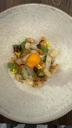 Het aperitief genoten we op het gezellige terras, met zicht op water en groen. Deze groene omgeving werkt bijzonder rustgevend en vormt een mooie inleiding op de culinaire ervaring. Een kleine suggestie: enkele bloeiende planten aan de overzijde van het water zouden het idyllische plaatje nog versterken. Zowel het alcoholische als het alcoholvrije huisaperitief waren bijzonder fris, verfijnd en smaakvol – een beloftevolle start. Daarbij kregen we drie kleine maar hoogstaande hapjes, vakkundig toegelicht door chef Romeo zelf, wat zorgde voor een persoonlijke toets.