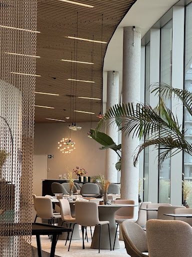 Zeer mooi hedendaags interieur, met verschillende afgeschermde zitplaatsen waar je als groep rustig zit in het restaurant. Cocon nestje.