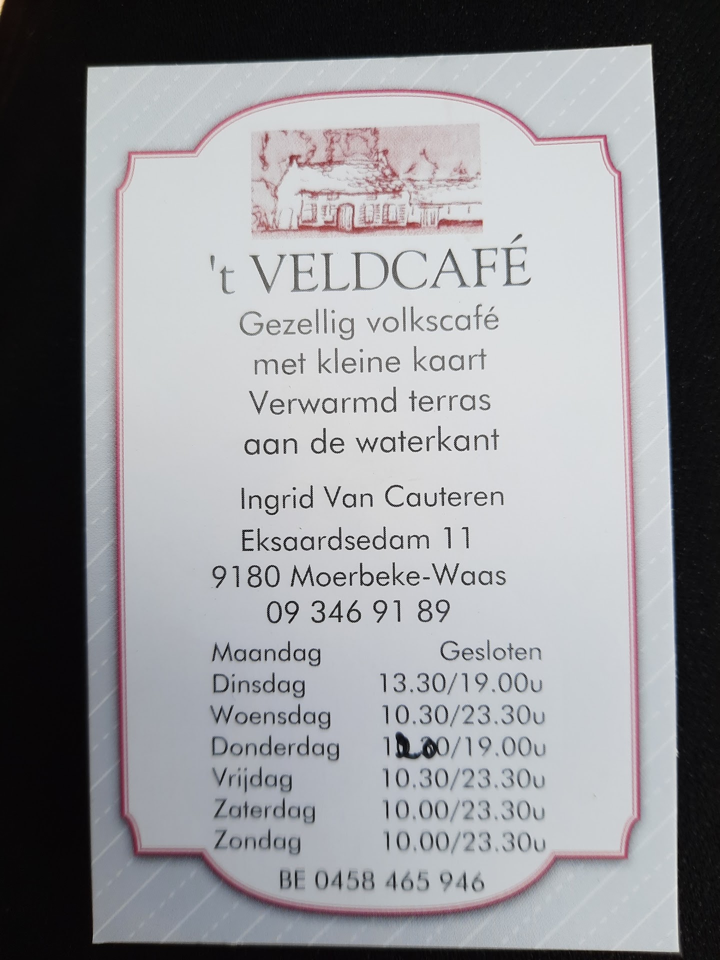 Read moreHet Veldcafé hebben ik en mijn vader een serieus tijdje geleden ontdekt, en zijn er vele keren teruggekomen, omdat het dicht bij Moerbeke-Waas ligt, bijna in Eksaarde, maar toch in Moerbeke naar het schijnt, goed toeven bij het water langsheen dit café, en mijn vader nam geregeld eens een Orval bier voor te consumeren, de prijzen daar zijn ECHT wel democratisch nog! En we kwamen er graag, ik zeg kwamen, nu kom ik alleen met vrienden of collega's, want mijn vader is een klein tijdje geleden overleden, daarom kom ik er ook nog graag, de herinneringen en goeie tijden zijn er wel geweest daar in het Veldcafé,...
