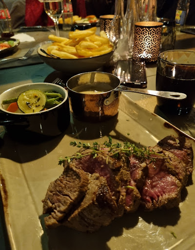 Wij zijn niet van hier en kozen dit restaurant omdat hun website ons aansprak, Incl de kaart. Het was een hete avond en zaten in de tuin, maar wat een hels lawaai zeg van de straat, hup weg Rust, echt niet te doen! Voorgerecht carpaccio van tonijn met erg veel, van alles erop, de sneetjes tonijn waren zo dun dat de ondergrond er volledig door kwam kijken, volgens mij nog geen 50gram, enfin, niks van de tonijn geproefd, = weggesmeten geld. Volgens hun site zijn ze beroemd om hun malse en smakelijke steaks… Dat willen wij zeker niet missen! We kregen een vrij groot stuk vlees, en het moet gezegd zijn, hij was perfect gebakken (bleu-chaud), maar de steaks waren absoluut niet zo zacht, in tegendeel, stevig snijden en kauwen was de boodschap! De smaak was neutraal, maw geen karakter, Maar de gevraagde peperroomsaus, was gewoon opgewarmde naturel room met er wat groene peperbolletjes in, dit is absoluut GEEN pepersaus, vriest je dit in en je hebt een romig ijsje… Dit verteld ook wel veel over de kok, die er duidelijk ofwel niets vanaf kent, ofwel er zich zo vlug mogelijk vanaf wil maken... Toen ik later onze rekening vroeg, bleek dat zij daar wel echt werk en moeite van gemaakt hadden, dit off-festijn koste ons 105€ en niet te vergeten een klein potje mayonaise 1€ zeg, dat zijn 4000 oude Belgische ballen voor knoeiwerk en onkunde! Ok, wij zijn streng met onze reviews, maar, als je gans je leven keihard gewerkt heb voor iedere centiem, dan vinden wij het ook logisch dat wij graag ons geld uitgeven aan zaken die waar voor ons geld bieden, die er gelukkig wel zijn!. Maar spijtig genoeg zijn er TE veel van zulke slechte “kok’s” als...