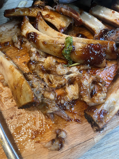 Read moreToen we binnenkwamen werden we meteen welkom geheten door de ober achter de bar. Het duurde even voor de ober in de zaal ons een tafel toewees, ook al zagen we lege tafels. We bekeken het menu via de QR-code en maakte onze keuze. We wachtten tot iemand onze bestelling kwam opnemen maar dit gebeurde niet… we staken ons hand op naar een van de obers, hij knikte maar kwam onze bestelling nog steeds niet opnemen. Toen ik een ober tegenhield en zei dat we wouden bestellen zei hij dat we nog even moesten wachten. We begrepen niet waarom want het was niet erg druk in het restaurant, misschien kon de keuken niet volgen met de bestellingen maar dan hadden we op z’n minst toch al onze drank kunnen bestellen? Het meisje dat daarna onze bestelling kwam opnemen, was niet zo beleefd en professioneel in haar communicatie naar ons toe. Daarna kregen we snel onze drankjes en het voorgerecht. De kaas-en garnaalkroket waren erg lekker, het slaatje erbij stelde niet veel voor. De prijs (€13) was wat aan de hoge kant. De ober nam het lege bord weg, zonder te vragen of het gesmaakt had, of of het hoofdgerecht al mocht komen. Als hoofdgerecht namen we beide ribbetjes. De zoete ribberjes waren heel lekker qua smaak, jammer dat de ribbetjes niet gekuist waren en er nog zo veel vet aanhing. De pikante ribbetjes waren een beetje verbrand en er werd wat samouraï overgegoten. Dit zag er zeer slordig uit. Beter zou zijn als de marinade van de ribbetjes pikant is, pikante saus kan dan nog steeds in een potje geserveerd worden. Bij beide ribben was het vel niet verwijderd, dit was een onsmakelijke ervaring. We betaalden €29 per portie voor de ribbetjes met frietjes. Voor deze prijs had er zeker een sausje bij de frietjes en een slaatje bij de ribbetjes gemogen. Heel gemixt gevoel bij dit restaurant. Het ziet er heel mooi uit, zeker een plus voor de inrichting. Maar het team lijkt me jong en onervaren. Een van de serveesters had een blouse zonder bandjes aan, waardoor haar bovenlijf half ontbloot was, dit had ik niet verwacht in een halal-restaurant. Het eten was lekker, maar de kwaliteit en het concept van de ribbetjes kunnen nog beter. De prijs is ok, maar aan de hoge kant voor de over...