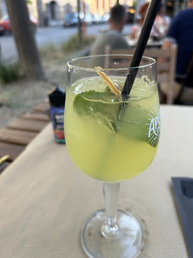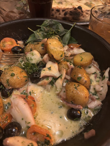 We ordered the mozzarella pizza, and I have to say it was delicious. The texture was perfect — not soggy at all — and the dough had a slightly salty, well-fermented flavor. It was the most affordable option on the menu at around €14.50, while the other pizzas were €20 and up, which felt a bit expensive for pizza, though again, maybe due to the celebration.