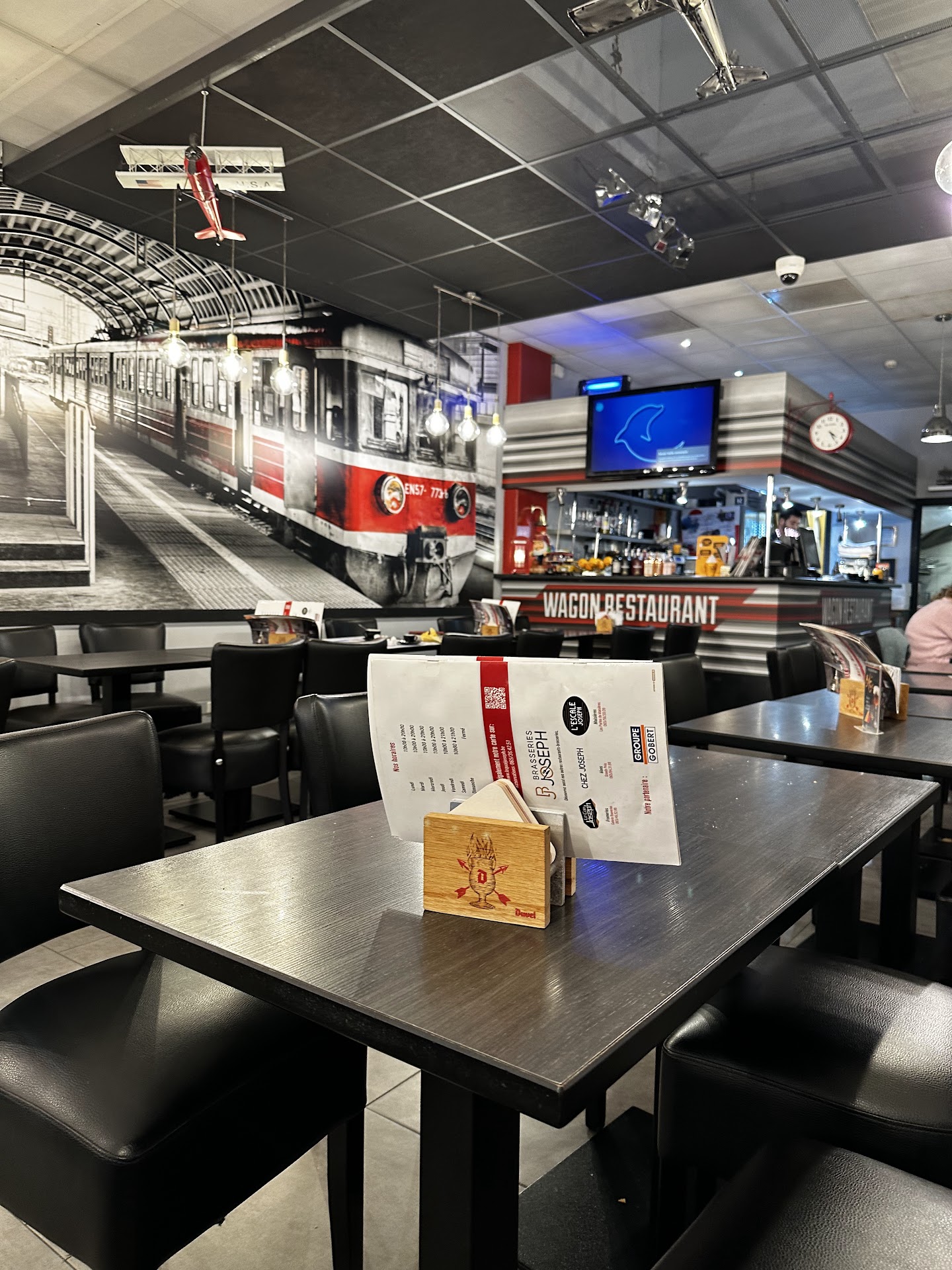 This restaurant has a unique and charming decor, featuring old trains and a train station theme. I ordered a hot chocolate, which was sweet but not overly so—just right. For my meal, I had the bacon cheeseburger, which I requested well-done; it came out a bit dry, but I believe that was due to my preference. The complimentary bread and butter were a nice touch, especially since I was quite hungry when I arrived. Overall, the atmosphere was great, the service was fast, and the waiter was very kind. I would definitely...