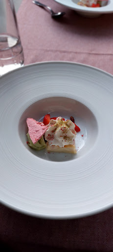 Repas : le chef est certainement un bon cuisinier mais il y a des incohérences dans les quantités et l’esthétique des plats. Prenons l’entrée du moment, la mosaïque d’asperges blanches, saumon gravlax, agrumes. Ce plat consiste en 1 seul petit rectangle de saumon fumé de +/- 2 X 3 cm avec 3 mini demi morceaux d’asperge et quelques pousses d’asperge ! C’est juste digne d’un amuse-bouche. À l'inverse, Nous voulons bien manger du pain mais pas 4 corbeilles ! Nous avions tellement faim que nous avons pris l’assiette de fromage choisie sur le chariot. On peut comprendre que le restaurant est de petite taille et qu’il ne serait pas raisonnable de disposer d’un large assortiment de fromage qui ne serait pas consommé à court délai. Cela étant dit pour proposer une dizaine de fromages, du sirop de liège et de la compote de pommes, il vaudrait mieux servir directement l’assiette de fromage sans passer par la case « choix au chariot ».