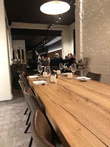 Het concept Dynamische menuâs: Elke 6 weken een nieuwe degustatiemenu, wekelijks een verrassend marktmenu (âŹ55 voor 2 gangen), en mogelijkheid tot Ă la carte. Zomerterras: In warmere maanden kun je hier aperitieven genieten, maar vandaag verwelkomt het moderne interieur ons met warme accenten: gebakken aarde-gevelstenen die als kunstwerken aan de muur prijken, hoge plafonds en een open keuken die naadloos aansluit op de zaal. De hartelijke ontvangst door Sofie, Mattias en hun team verdrijft meteen de grauwe dag.