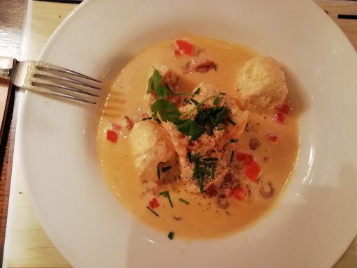 Read moreGezellig interieur, vlotte en vriendelijke bediening. Maar...oncomfortabel zitten. Zetels veel te laag in verhouding van tafel hoogte. Plus...Picon au vin blanc, (8€) wordt geserveerd in een champagneglas!. Wijn, en amper een paar druppels Picon bijgevoegd) Mijn tafelgenote had een glas water gevraagd (2,2€) geserveerd zonder fles. (Chateau de la Pompe?) Aan andere tafels werd ook water geserveerd...allemaal in fles zonder dop! Het eten 'varkenswangetjes' besloeg meer dan de helft van het bord. Daarbij kroketjes. Alles op een bord gesmeten , zonder de minste presentatie! Bij het serveren vroeg men of wij er sla bij wilden. De varkenswangetjes waren wel lekker. Kwaliteit van eten is natuurlijk hoofdzaak, maar men eet ook met zijn ogen! Presentatie is dus ook belangrijk en getuigt dat men met liefde kookt, en presenteert. Wat hier dus duidelijk niet het geval was. Sorry, maar hier kom...
